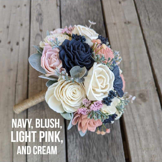 Navy Blue and Blush Pink Artificial Wedding Bouquet with Sola Wood Flowers, Wooden Flowers Bridal Bouquet, Blush Bridesmaid Bouquet