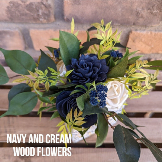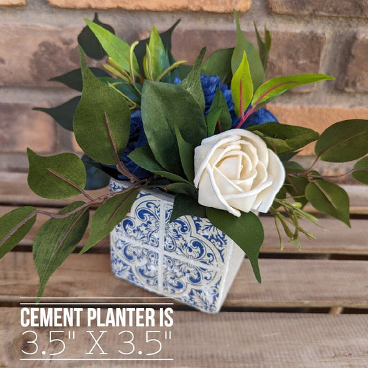 Pre-made Navy Blue Cement Planter Table Centerpiece with Wood Flowers, Wood Flower Centerpiece Decor, Thank You or Get Well Soon Gift